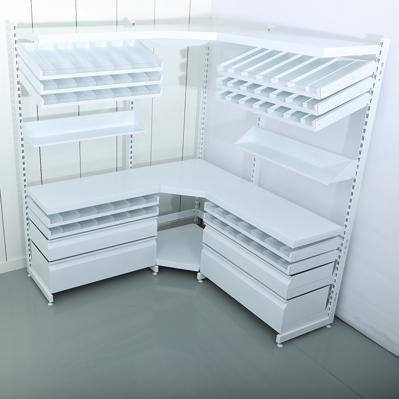 Tablette métallique fixe pour angle entre 2 gondoles.Peut servir de plan de travail, posée en milieu de hauteur de gondole.Livré avec support arrière à fixer sur une colonne d'angle réf. 740 90000 21101.Pour les fixations latérales sur montants de gondoles, utiliser 2 consoles réf. 740 96000 04001 ou 740 96000 05001 (à commander séparément).