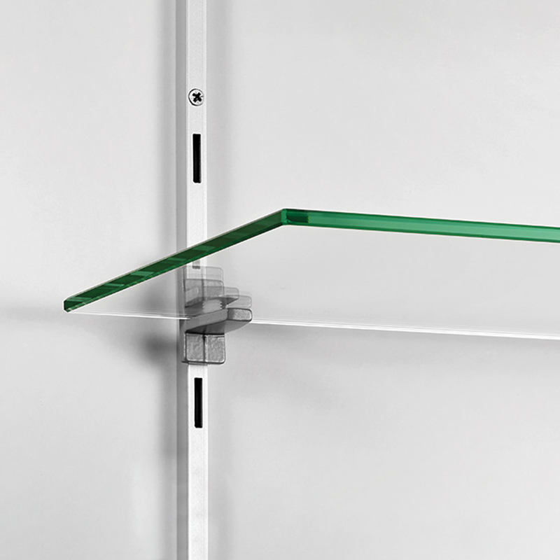 Support pour tablette verre, avec vis de serrage en nylon sur le dessus.Fixation sur crémaillère à perforation étroite au pas de 50mm.Pour tablette de profondeur maxi 100mm.