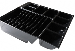 Tiroir caisse en bois robuste avec serrure à clés - sans alarme sonore.Equipé de côtés de tiroirs métalliques, façade médium gris foncé vernis.Trieur à monnaie et à billets extractible.Pour bar, banques...