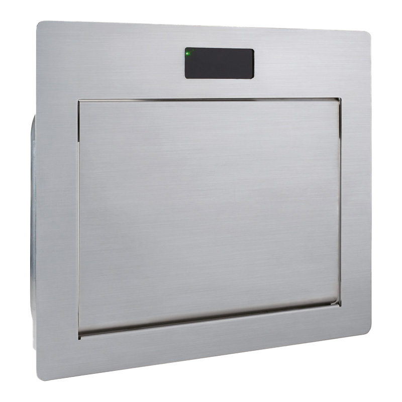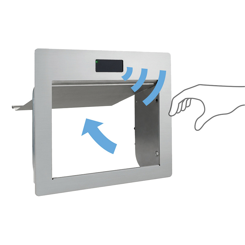 Trappe de poubelle en inox sans contact pour un côté hygiénique.Le couvercle s'ouvre automatiquement lorsque le capteur détecte une main. La distance de détection peut-être ajuster jusqu'à 300mm, à l'aide de la molette à l'arrière. Possibilité d'ouverture manuelle en cas de coupure électrique.Trappe pour pose a la verticale et pour utilisation en intérieur.