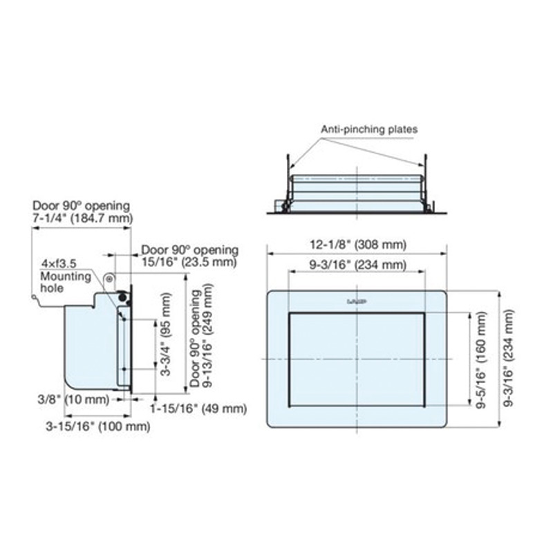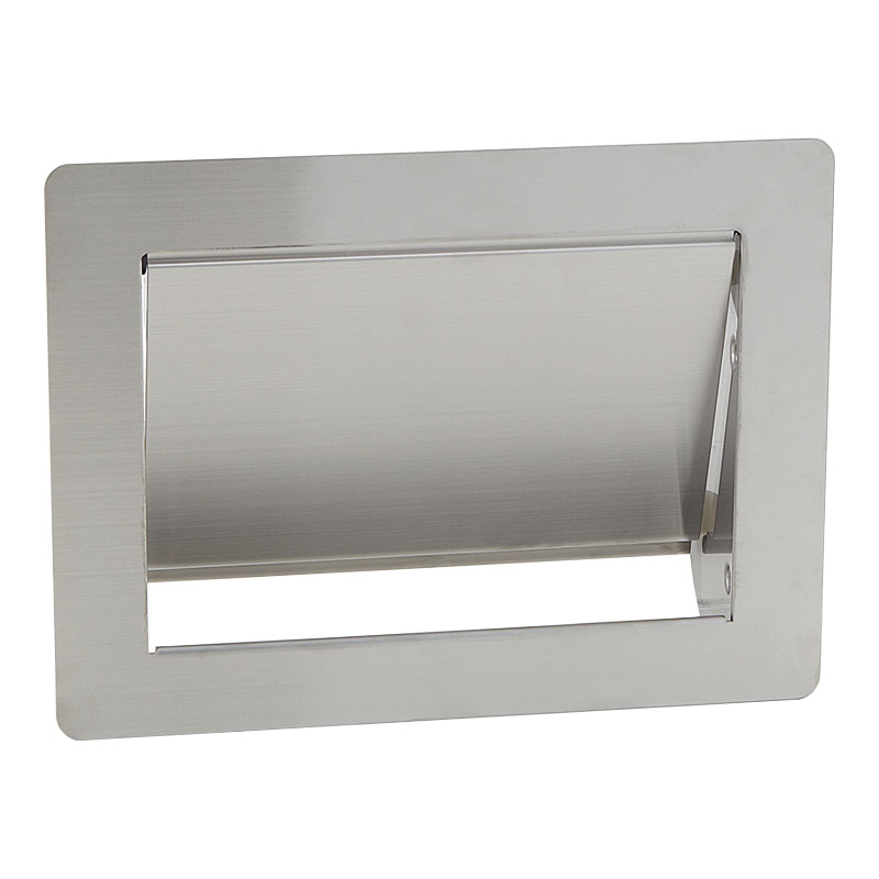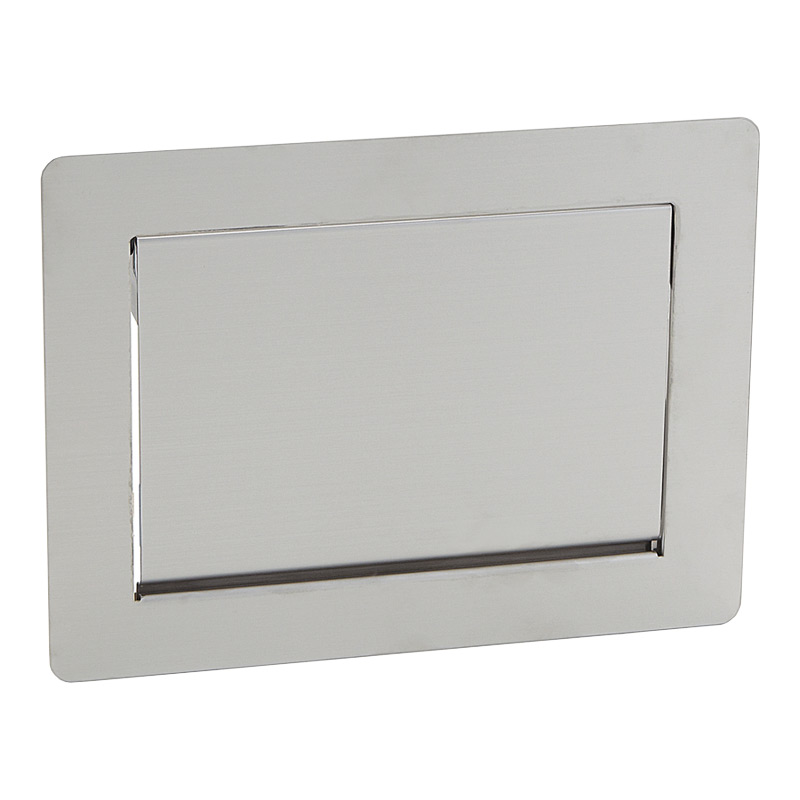 Trappe de poubelle en inox pour pose à la verticale. Ouverture large et fermeture du clapet amortie.Dimension d'encastrement de la trappe 234x160mm.Résistant à la corrosion.