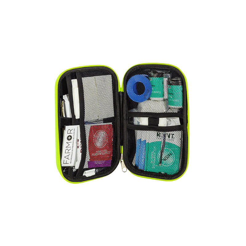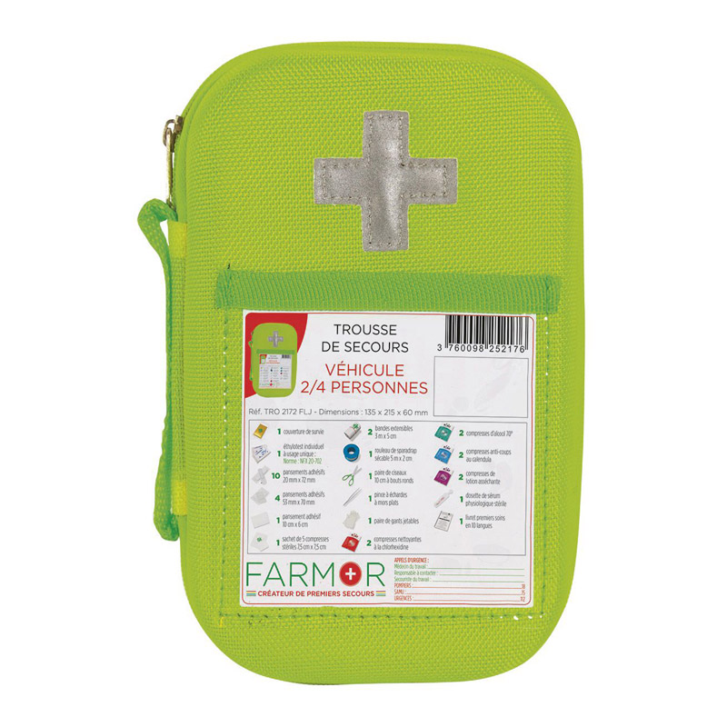 contient tous les éléments nécessaires pour apporter les premiers soins en cas de petites blessures (compresses imprégnées de solution nettoyantes et assainissantes cutanée, compresses anti coup, dosettes de sérum physiologique stériles) ainsi q'une couverture de survie et un ethylotest à usage unique