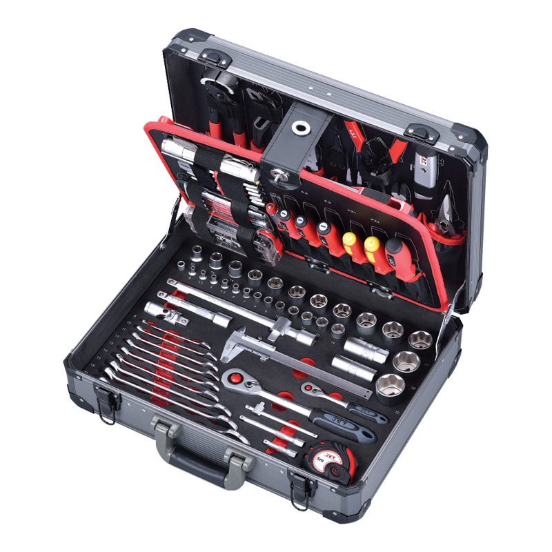 Outils ergonomiques d'excellente qualité, pour une facilité d'emploi maximale inserts en mousse compacte bicolore pour assurer une tenue parfaite et maintenir l'ordre dans les outils coffret en aluminium. 1 x Tenaille 250 mm 1 x Pince multiprise 250mm 1 x Pince coupante de côte 160 mm 1 x Pince à bec droit 200 mm 1 x Pince universelle 185mm 1 x Cisaille universelle 185 mm 1 x Jeu de pinces pour circlips 4-pces. 1 x Cutter 1 x Marteau de serruriers 300 g 1 x Clé à molette 10 à 250 mm 1 x Jeu de clés 6pans à tête sphérique de 1.5 à 10 mm 1 x Scie à métaux 300 mm 1 x Lampe de poche 1 x Aimant télescopique 1 x Jeu de burins et chasse-goupilles 5-pces. 1 x Boîte d'embouts 61 pces. 1 x Boîte d'embouts de précision 22 pces 1 x Tournevis plat indicateur de tension 100 - 250 V 2 x Tournevis : Pozidriv PZ1, PZ2, 3 x Tournevis pour vis à fente : 0.5x3x75mm, 0.8x4x100mm,1x5x100mm 1 x Tournevis porte-embouts 1/4 1 x Cliquet réversible 1/4 48 dents 1 x Cliquet réversible 1/2 48 dents 3 x rallonges 1/4 (50-100-115 mm) 2 x rallonges 1/2 (125-250 mm) 2 x cardans universels (1/4-1/2) 2 x douilles bougie 1/2 (16-21) 1 x Pied à coulisse 150 x 0.01 mm 1 x Mètre à ruban de 5 m 8 x Clé mixte. Composition : 8, 10, 12, 13, 14, 17, 19, 22 mm 13 x Douille 1/4 25 mm. Composition : 4, 4.5, 5, 5.5, 6, 7, 8, 9, 10,11, 12, 13, 14. 11 x Douille 1/2 38 mm. Composition : 10, 13, 14, 16, 17, 18, 19, 20,22, 24, 27. 2 x Douille 1/2 45 mm. Composition : 30 et 32. 1 x un jeu de deux clés pour fermer la valise dimensions : 510 x 200 x 430 mm poids : 12,8 kg.