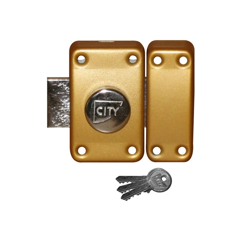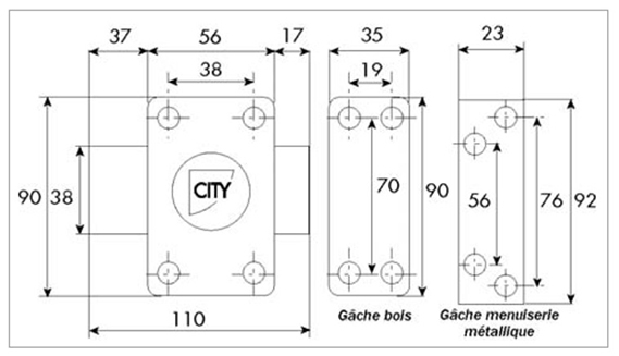 Boitier 56 x 90mm et gâche 35 x 90mm en acier embouti finition époxy.Bouton côté intérieur.Côté extérieur : cylindre à 5 goupilles - dimensions Ø 23mm x L.45mmLivré avec 3 clés.