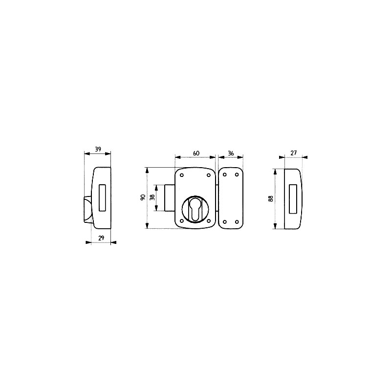 Boîtier 60 x 90mm et gâche 36 x 90mm en acier embouti finition époxy.
