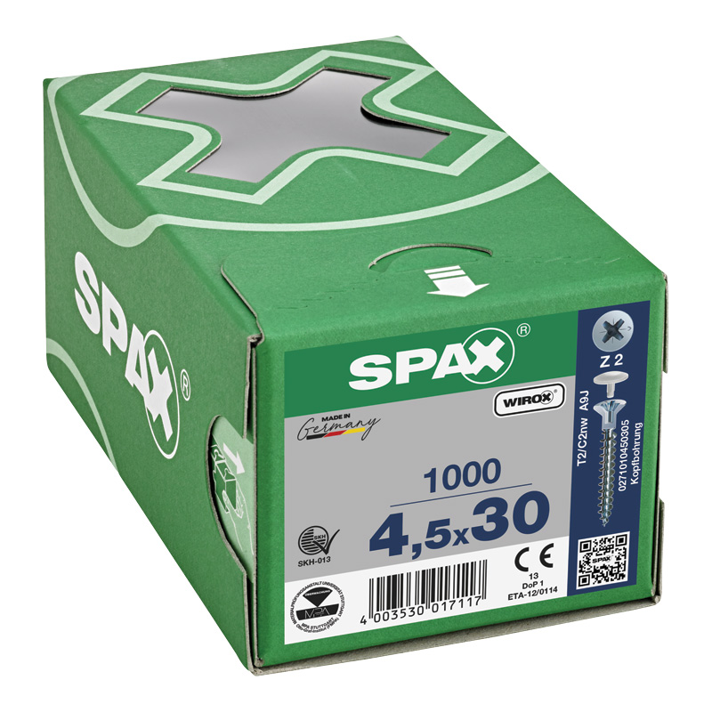 Vis tête fraisée avec trou (Ø 2,5mm) pour cache-vis plastique SPAX.Revêtement WIROX : protection anticorrosion 20 fois plus élevé que le zingage blanc (conforme à la norme DIN EN 1670, classe 5), sans chrome VI donc plus écologique.
