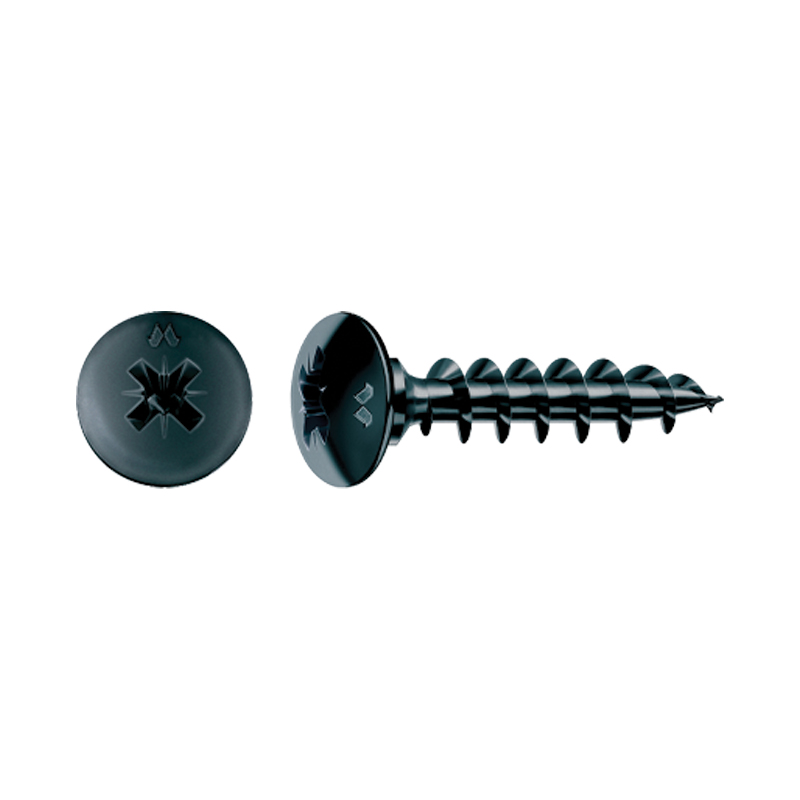 Vis Panelvit FC tête bombée large (pour une meilleure pression de serrage et couverture du trou) à empreinte cruciforme (PZ). Revêtement noir avec traitement anti-griffures.Vis indiquée pour la fixation de charnières et pentures sur menuiseries bois et PVC.Le collet sous-tête permet un centrage du trou et un vissage dans l'axe, afin d'éviter l'inclinaison du volet.Le traitement galvanique NEROPLUS confère à la vis une résistance à la corrosion > 1000H en brouillard salin (grade 5 de la norme NF EN 1670).