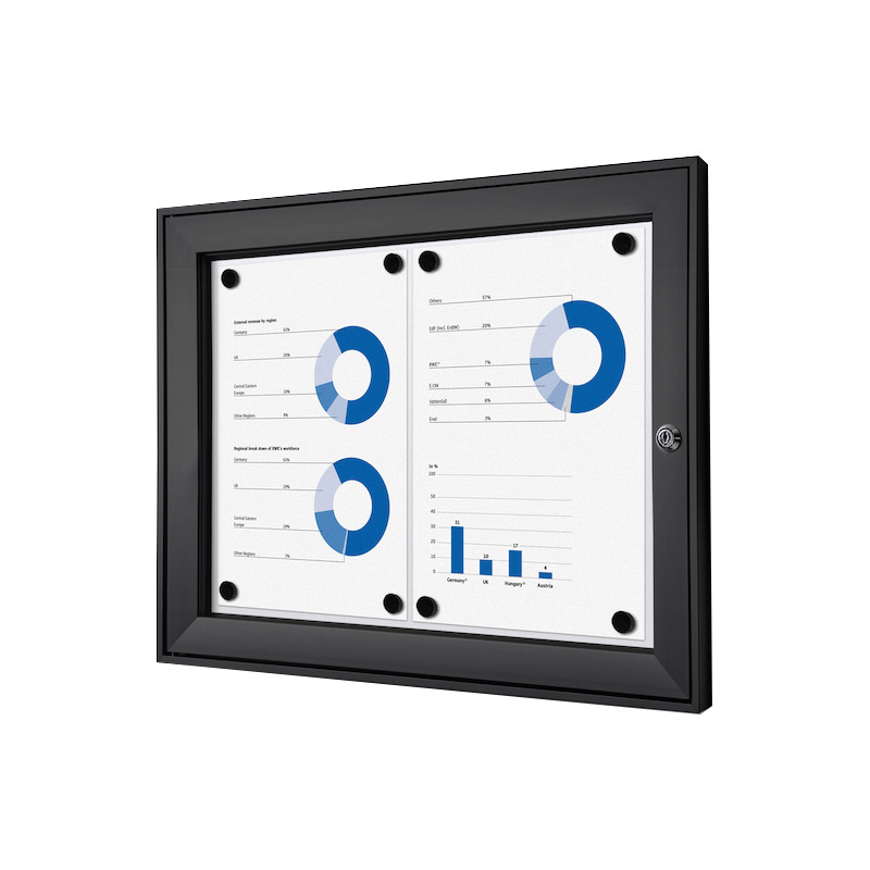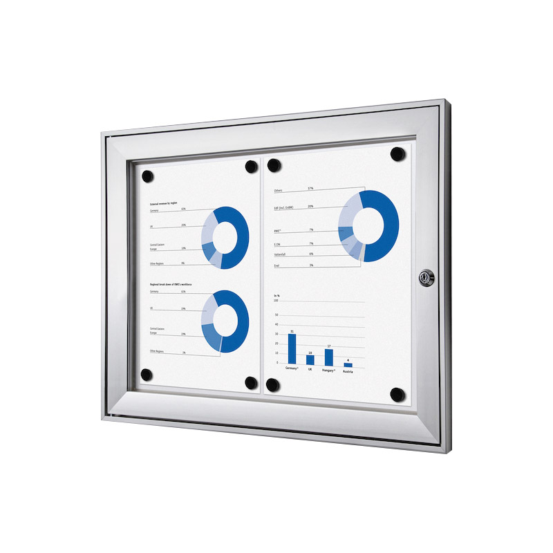 Vitrine d'affichage standard à fond magnétique et inscriptible, pour usage intérieur (et extérieur sous abri uniquement).Porte en acrylique à ouverture latérale, avec verrouillage (serrure avec 2 clés).Profil cadre aluminium 41x23mm. Joint en caoutchouc siliconé. Profondeur interne de 13mm.