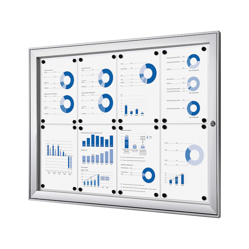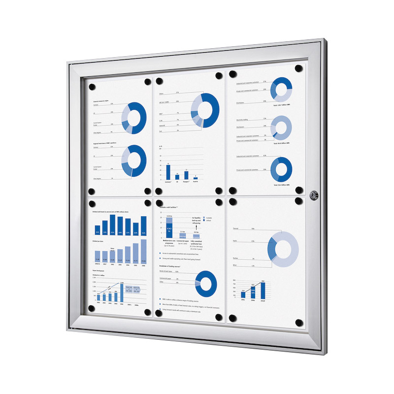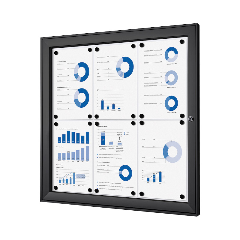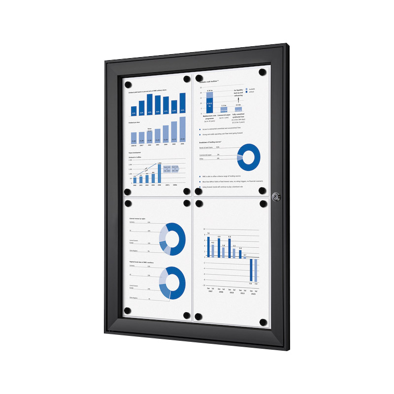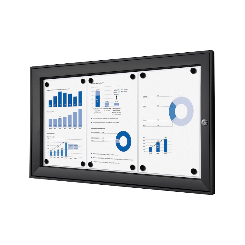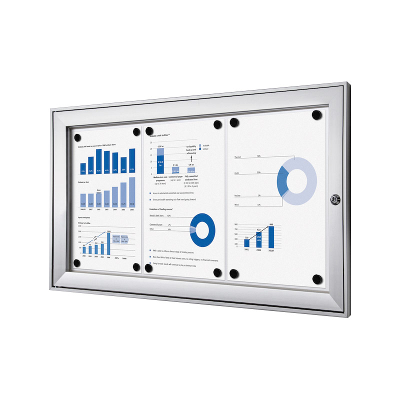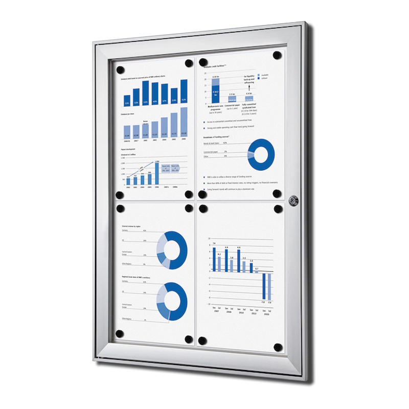 Vitrine d'affichage standard à fond magnétique et inscriptible, pour usage intérieur (et extérieur sous abri uniquement).Porte en acrylique à ouverture latérale, avec verrouillage (serrure avec 2 clés).Profil cadre aluminium 41x23mm. [...]